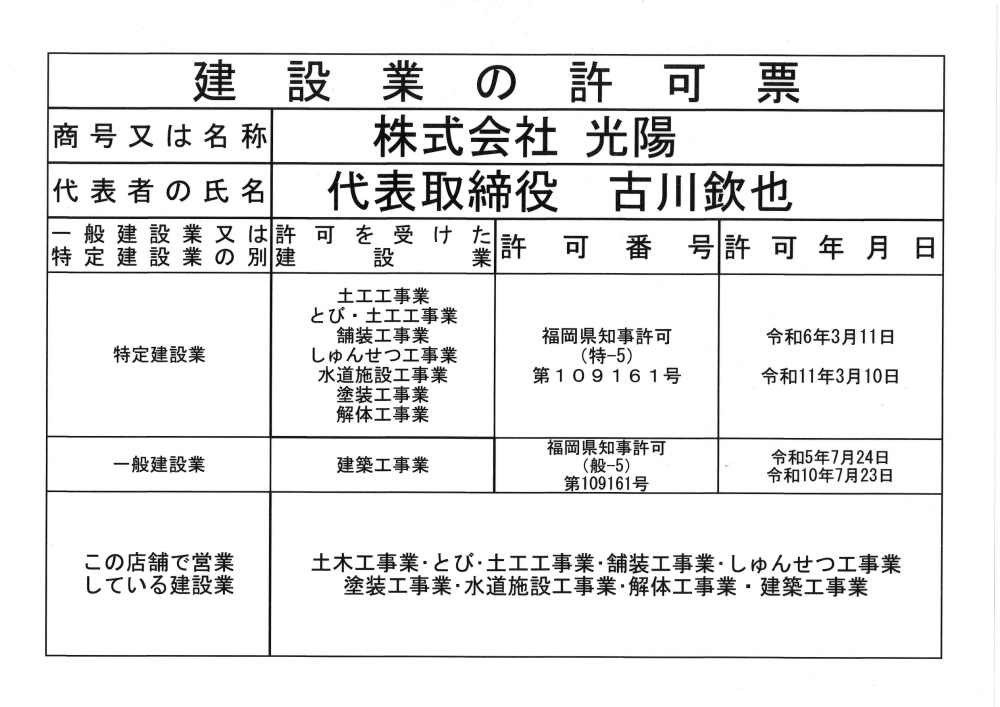 | 建設業許可番号 | 福岡県知事 許可(特-5)第 109161 号 福岡県知事 許可(般-5)第 109161 号 |