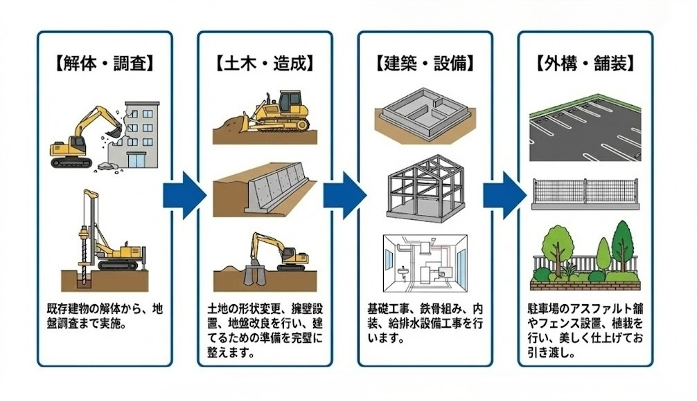 宅地造成から工場用地の大規模造成、公共インフラ整備まで。